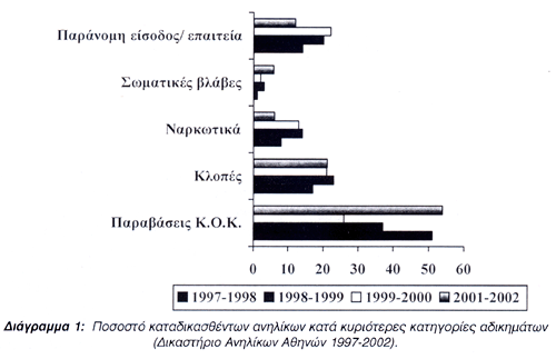 Τρεις είναι οι βασικότερες κατηγορίες αδικημάτων που διαπράττονται από εφήβους (13-17 ετών) και μετεφήβους (18-20 ετών). Το μεγαλύτερο ποσοστό ανήκει στις παραβάσεις ειδικών ποινικών νόμων, όπως του Κώδικα Οδικής Κυκλοφορίας (Κ.Ο.Κ.), του νόμου περί των ναρκωτικών, της παράνομου εισόδου στη χώρα καθώς και η επαιτεία. Αυτές οι παραβάσεις συνήθως ξεπερνούν το 70% του συνόλου των περιπτώσεων. Ακολουθούν τα αδικήματα κατά της ιδιοκτησίας - ιδίως, οι κλοπές και οι "κλοπές χρήσης" δικύκλων ή αυτοκινήτων - περί το 20% και έπεται ως τρίτη κατηγορία η πρόκληση σωματικών βλαβών σε ποσοστό από 2 έως 10% (βλέπε Διάγραμμα 1). Ο Κουράκης4 σε μια συστηματική επισκόπηση των στατιστικών στοιχείων από το 1984 έως το 1995, σημειώνει, ειδικότερα για την ηλικιακή ομάδα των 13-17 ετών, μια ελαφρά ανοδική τάση στο ποσοστό πρόκλησης σωματικών βλαβών καθώς και στο ποσοστό φθοράς/ιδιοποίησης ξένης ιδιοκτησίας. Επισημαίνει επίσης μια αυξητική τάση στις παραβάσεις ειδικών ποινικών νόμων, που οφείλεται κυρίως στις παραβάσεις Κ.Ο.Κα, οι οποίες όμως δεν μπορούν από μόνες τους να αποτελέσουν σοβαρή ένδειξη για τη διαχρονική αύξηση της "εγκληματικότητας" των εφήβων. Για τα δε σοβαρά αδικήματα (ανθρωποκτονίες και σωματικές βλάβες από πρόθεση, βιασμούς και ληστείες) συμπεραίνει ότι η εγκληματικότητα των εφήβων δεν εμφανίζει αυξητική ή φθίνουσα τάση, κυμαίνεται δε σε χαμηλά επίπεδαβ. Ανάλογα συμπεράσματα βγαίνουν από την επισκόπηση των στοιχείων για την ένδικη παραβατικότητα που δόθηκαν από την Εθνική Στατιστική Υπηρεσία της Ελλάδος (Ε.Σ.Υ.Ε.)6 για την περίοδο 1992-1996. Τα στοιχεία δεν εμφανίζουν στατιστικά σημαντικές αυξομειώσεις στην αποτύπωση των αδικημάτων, ούτε απεικονίζουν μια ανησυχητική έξαρση της νεανικής παραβατικότητας.