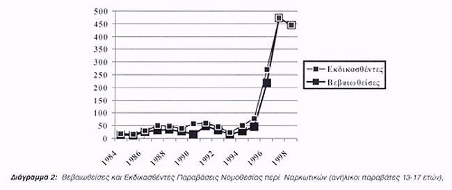 Παρά το γεγονός ότι με την ψήφιση της νέας νομοθεσίας περί ναρκωτικών (1987) υπάρχει μια γενικότερη τάση να αποφεύγεται στην πράξη η σύλληψη ή/και η ποινική αντιμετώπιση των απλών χρηστών, αξίζει να επισημανθεί η σαφής αυξητική τάση των εφήβων που υποκύπτουν σε παραβάσεις της νομοθεσίας περί ναρκωτικών μετά το 1996 (βλέπε Διάγραμμα 2). Σημειώνεται ότι η χρήση ουσιών από τους μαθητές είναι αρκετά υψηλή και τοποθετείται περίπου στο μέσο όρο των χωρών της Ευρωπαϊκής Ένωσης7.