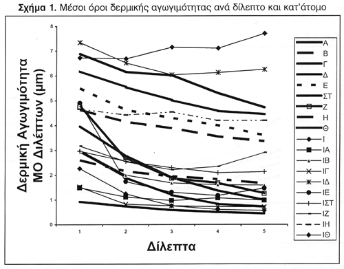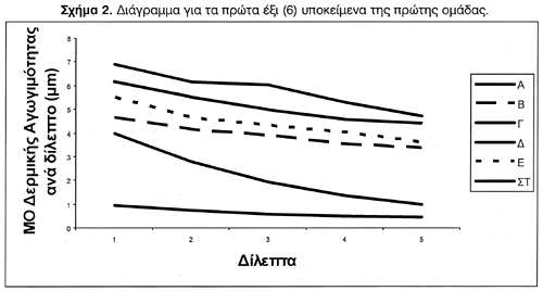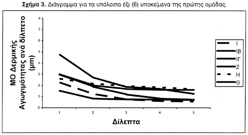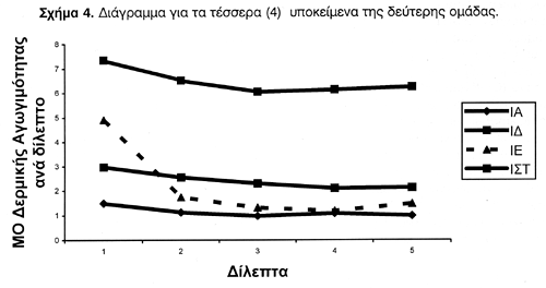 β) Στη δεύτερη σαφώς μικρότερη ομάδα εντάσσονται τέσσερα (4) υποκείμενα. Αυτά φαίνεται να συμπεριφέρονται ομοίως διαφέρουν όμως από τα προηγούμενα δώδεκα, κατά το ό,τι τουλάχιστον ένας από τους μέσους όρους των διλέπτων είναι μικρότερος άλλου, μεταγενέστερου χρονικά διλέπτου, κατά συνέπεια η δερμική αγωγιμότητα μειώνεται συνολικά, αλλά ασυνεχώς (σχήμα 4).