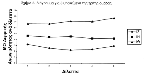 γ) Στη τρίτη ομάδα εντάσσονται τρία υποκείμενα, των οποίων η συμπεριφορά δεν μπορεί να ενταχθεί σε μια από τις προηγούμενες ομάδες. Συγκεκριμένα η συμπεριφορά του ενός υποκειμένου είναι εντελώς αντίστροφη από τα προηγούμενα. Η δερμική αγωγιμότητα στη συγκεκριμένη περίπτωση φαίνεται να ακολουθεί μια ανοδική πορεία. Η δερμική αγωγιμότητα του δευτέρου υποκειμένου της ομάδας από το τρίτο δίλεπτο και μετά ακολουθεί ανιούσα πορεία. Το τρίτο υποκείμενο της ομάδας φαίνεται σε μερικά δίλεπτα να παρουσιάσει ανιούσα δερμική αγωγιμότητα σε άλλα κατιούσα και σε άλλα σταθερή (σχήμα 5).
