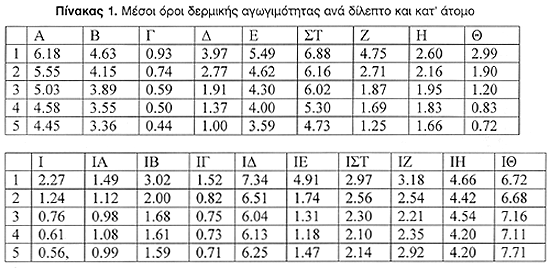 Τα αποτελέσματα φαίνονται στον πίνακα 1, στον οποίο καταγράφονται οι μέσοι όροι των τιμών της δερμικής αγωγιμότητας ανά δίλεπτο και κατ'άτομο.