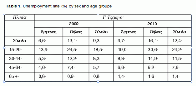 The current global economic crisis that has also hit the Greek society could bring about a host of transformations with major repercussions on both personal and collective levels. The problematic structure and operation of the Greek state enhances the impact of this crisis revealing unresolved issues building up for a considerable amount of time and for which the Greek society has failed to bear the cost of adopting the suggested solutions.Considering the major economic depressions of the last century (the 1929 crash, the Asian financial crisis in the mid-90s) and the periods of financial predicament and poverty experienced by the nationals, there is no doubt that unemployment, insecurity and social exclusion will rise and take their toll on Greek citizens. In fact, Greece belongs to that group of countries whose history is strewn with economic downturns, destruction and warfare. Based on the National Statistical Service of Greece, there has been a rise in the unemployment rate to12.4% (data collected on October 2010) (See table 1).