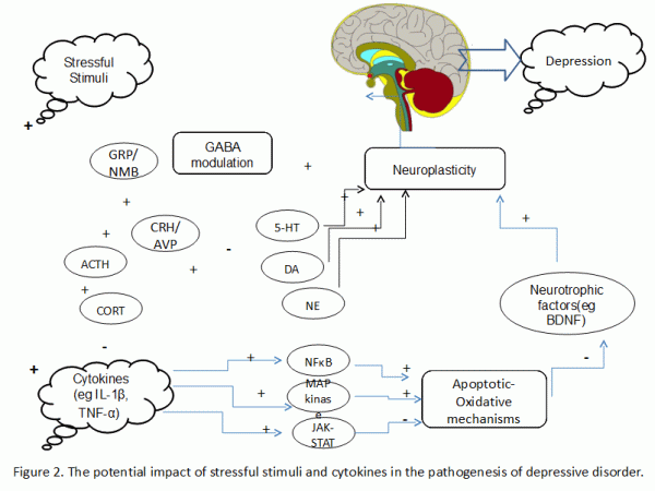 The relationship between stress and the immune system is well recognized and the idea that cytokines as factors of inflammation, may contribute to depression and neurodegeneration, is gaining ground. The involvement of the inflammatory process in Alzheimer's disease plays a central role and we should stand in the fact that some of these processes are present in depressed patients too. Some cytokines (IL-6, IL-1, TNFa), which are found to be elevated in depression, are increased also in dementia and the most important is that such inflammatory molecules appear to be involved in the pathogenesis of the AD, giving ground on the idea that both disorders can result in a sequential manner. More specifically, the activation of the immune system by an inflammatory cause, may be considered to facilitate depression, via the action of cytokines which are either entering the brain through blood circulation, or are synthesized de novo in the CNS. Those cytokines can cause processes, which are common with those activated by the classical stressful stimuli. It is even suggested that stress and cytokines can act in a synergic way24,25 (Figure 2) promoting the release of factors of the HPA axis, an event that affects serotonin, whose changes influence mood and cause depression either directly, or indirectly through the lowering of brain plasticity.