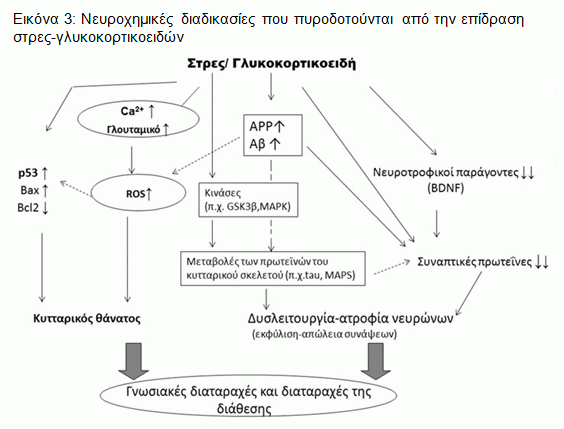 Όπως φαίνεται στην Eικόνα 2, το στρες και οι κυτταροκίνες μέσω της ενεργοποίησης άλλων χημικών παραγόντων (κινασών και πρωτεΐνης MAP) θα μπορούσαν να επηρεάσουν την εξέλιξη αποπτωτικών και οξειδωτικών μηχανισμών, με αποτέλεσμα την αλλοίωση της παραγωγής του νευροτροφικού παράγοντα BDNF (νευροτροφικός παράγοντας εγκεφαλικής προέλευσης), την ελάττωση της πλαστικότητας του εγκεφάλου και την κατάθλιψη26. Η ελάττωση της παραγωγής του παράγοντα BDNF, είναι κάτι που παρατηρείται και στη ΝΑ και μάλιστα μπορεί όπως φαίνεται και στην Eικόνα 3 να προκύψει ως αποτέλεσμα του στρες και της αύξησης των γλυκοκορτικοειδών. Στην ίδια εικόνα βλέπουμε το πώς το στρες και τα GC μπορούν να πυροδοτήσουν τον κυτταρικό θάνατο μέσω αποπτωτικών διαδικασιών με τη συμμετοχή πρωτεϊνών που σχετίζονται με τον κύκλο ζωής του κυττάρου (P53, p21) καθώς και προαποπτωτικών παραγόντων της οικογένειας Bcl-2 και έτσι να σταματήσουν τη νευρογένεση, καθώς και να οδηγήσουν σε ατροφία των νευρώνων μέσω της παραγωγής του Αβ αμυλοειδούς από πρόδρομες ουσίες και την υπερφωσφορυλίωση της tau πρωτεΐνης10.