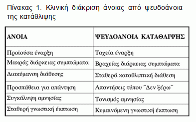 Σημαντικός αριθμός επιδημιολογικών μελετών προτείνουν ότι η καταθλιπτική διαταραχή στο ιστορικό του ασθενούς, συσχετίζεται με αυξημένη πιθανότητα ανάπτυξης γνωστικών διαταραχών1,2 και ειδικότερα με τη νόσο του Alzheimer3,4. Είναι βέβαια γνωστό πως κατά τη διάρκεια ενός καταθλιπτικού επεισοδίου κυρίως σε ηλικιωμένα άτομα μπορούν να εμφανιστούν γνωστικές διαταραχές, “δίκην άνοιας”. Αυτές είναι γνωστές ως ψευδοάνοιες. Ο όρος “ψευδοάνοια” χρησιμοποιείται για να περιγράψει μια κλινική εικόνα που χαρακτηρίζεται από κατάθλιψη σε συνδυασμό με ελάττωση των γνωστικών λειτουργιών, η οποία απαντά θετικά στην αντικαταταθλιπτική αγωγή και υποχωρεί με την ύφεσή της, σε αντίθεση με την κλασική άνοια η οποία έχει προοδευτική μορφή5. Η έννοια της ψευδοάνοιας δεν αποτελεί αντικείμενο της παρούσας εργασίας, κατά την οποία θα εξετασθούν οι κοινοί βιοχημικοί τόποι και αιτιολογικοί συσχετισμοί μεταξύ της νόσου Alzheimer και της καταθλιπτικής διαταραχής. Στον πίνακα 1 φαίνονται μερικά διαφοροδιαγνωστικά σημεία μεταξύ άνοιας και ψευδοάνοιας.