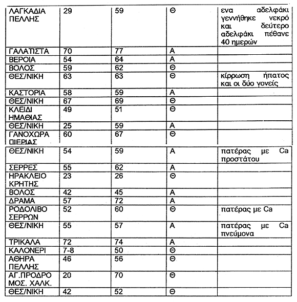 Στα περιστατικά που συγκεντρώσαμε σημειώσαμε τον αριθμό των περιστατικών ανά έτος, την γεωγραφική κατανομή, την αναλογία ανδρών-γυναικών, την μέση ηλικία εμφάνισης και κορύφωσης των συμπτωμάτων και το κληρονομικό ιστορικό που μπορεί να συνδέεται με την εμφάνιση της νόσου. Οι παρατηρήσεις μας συνοψίζονται στους παρακάτω δύο πίνακες. (πίνακας 1 και 2) ενώ η στατιστική ανάλυση παρουσιάζεται στα διαγράμματα 1, 2, και 3. Πρέπει να σημειώσουμε ότι στο σύνολο των 77 περιπτώσεων η στατιστική ανάλυση έγινε μόνο στα 54 περιστατικά λόγω ελλείψεων στους φακέλους.