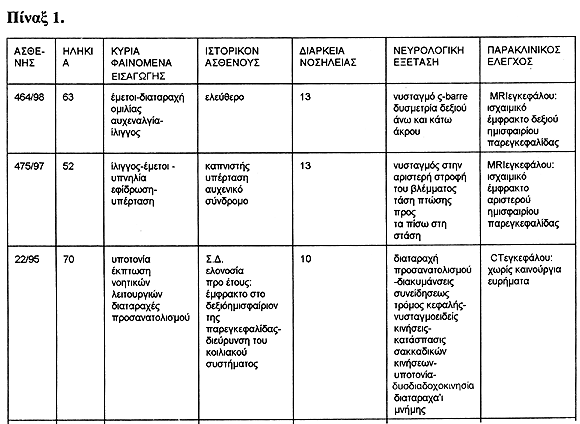 Τα κλινικά στοιχεία των πασχόντων και η εν γένει κατανομή των ισχαιμικών εμφράκτων της παρεγκεφαλίδας επί των ημετέρων περιπτώσεων αναλύονται εις τον κατωτέρω παρατιθέμενον πίνακα 1.