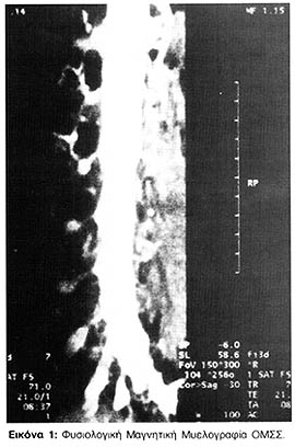 Η Μαγνητική Μυελογραφία της ΟΜΣΣ αναδεικνύει εξαιρετική σκιαγραφική αντίθεση και διακριτική ικανότητα. Οι νευρικές ρίζες διατρέχουν ωραιότατα διά μέσου του ΕΝΥ και η απεικόνιση του ΕΝΥ που εκτείνεται στα νευρικά έλυτρα είναι ικανοποιητική (Εικόνα 1). Οι εγκάρσιες τομές του νωτιαίου σάκκου δείχνουν εξαιρετικά υψηλή σκιαγραφική αντίθεση με τις περιβάλλουσες δομές και έξοχη απεικόνιση των νευρικών ριζών.