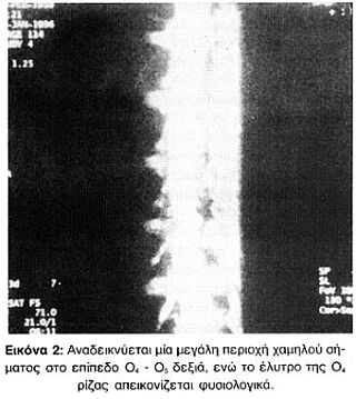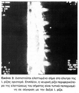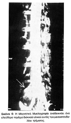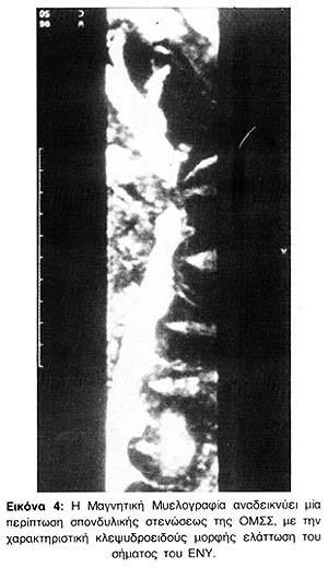 Η Μαγνητική Μυελογραφία μπορεί να αναδείξει ακτινολογικούς "ακρωτηριασμούς" των ελύτρων των ριζών, τριγωνικά οδοντώματα του νωτιαίου σάκκου από κήλη μεσοσπονδυλίου δίσκου και οσφυϊκή σπονδύλωση με στένωση του σπονδυλικού σωλήνα, με ή χωρίς νωτιαίο block (Εικόνες 2 - 5).
