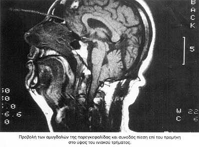 β. Προβολή των αμυγδαλών της παρεγκεφαλίδας δια μέσου του ινιακού τρήματος το κατώτερο σημείο των οποίων φθάνει μέχρι το οπίσθιο τόξο του Α1, σπονδύλου. Υπήρχε συνοδός πίεση επί του προμήκη στο ύψος του τρήματος.