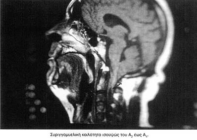γ. Συριγγομυελική κοιλότητα ισοϋψώς του επιπέδου του Α2 έως Α4, με έκταση 33 χιλ. προκαλώντας ελαφρά διόγκωση του νωτιαίου μυελού.