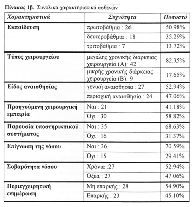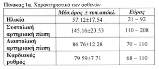 Η μέση ηλικία των ασθενών σε έτη ήταν 57.12±17.54, ενώ η αναλογία ανδρών/γυναικών ήταν 26/25. Χαρακτηριστικά των ασθενών παρουσιάζονται στους πίνακες 1α και 1β.