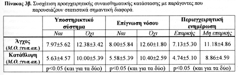 Επισημαίνεται, όμως, στατιστικά σημαντική διαφορά των επιπέδων άγχους και κατάθλιψης σε σχέση με την ύπαρξη ή όχι υποστηρικτικού για το άτομο συστήματος, την επίγνωση της ασθένειας καθώς και την περιεγχειρητική ενημέρωση (Πίνακας 3β).