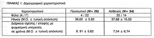 Δεν διαπιστώθηκε να υπάρχει στατιστικά σημαντική διαφορά μεταξύ προσωπικού και ασθενών όσον αφορά την ηλικία και τη διάρκεια σχέσης/επαφής με ψυχιατρική υπηρεσία.