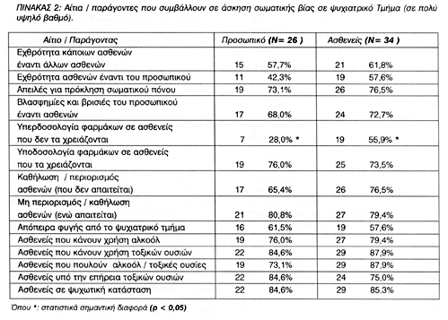 Στους πίνακες που ακολουθούν καταγράφονται τα αίτια/παράγοντες που συμβάλλουν σε άσκηση σωματικής βίας, σε πολύ υψηλό βαθμό, σε ψυχιατρικό Τμήμα (Πίνακας 2), οι επιπτώσεις από την άσκηση βίας σε κάποιον νοσηλευόμενο ασθενή (Πίνακας 3), καθώς και μέτρα που θα μπορούσαν να βοηθήσουν ώστε να ελαττωθεί η βία σε ψυχιατρικά Τμήματα (Πίνακας 4). Όλοι οι συμμετέχοντες στην έρευνα έχουν παραστεί σε επεισόδια βίας. Ποσοστό περίπου 40% και των ασθενών, αλλά και του προσωπικού, παραδέχονται πως υπήρξαν αυτουργοί σε επεισόδια βίας (κύρια λεκτικής επιθετικότητας).