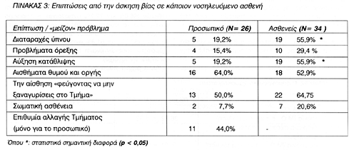 Διαταραχές ύπνου και αύξηση συμπτωματολογίας κατάθλιψης προβάλλει το 19,2% του προσωπικού και το 55,9% των ασθενών (στατιστικά σημαντική διαφορά, p<0,05), ως συναισθηματικές επιπτώσεις στον εαυτό τους από την επιθετικότητα και την άσκηση βίας στο Ψυχιατρικό Τμήμα (Πίνακας 3).