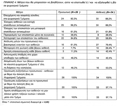 Όσον αφορά τα μέτρα που θα μπορούσαν να βοηθήσουν, ώστε να ελαττωθεί ή/και να εξαλειφθεί η βία σε ψυχιατρικά Τμήματα (Πίνακας 4), πολλοί περισσότεροι ασθενείς, συγκριτικά με μέλη του προσωπικού, προτείνουν τη «μεταφορά στη φυλακή κάθε βίαιου ασθενή» (29,4% των ασθενών έναντι 7,7% του προσωπικού, p<0,05) και την «άρνηση επανεισαγωγής κάθε βίαιου ασθενή» (42,4% των ασθενών έναντι 11,5% του προσωπικού, p<0,05), σαν μέτρα για τον περιορισμό της βίας.