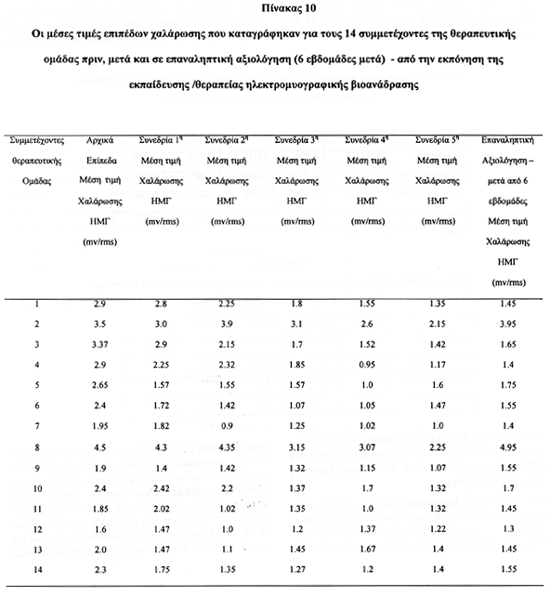 Οι μέσες τιμές επιπέδων χαλάρωσης που καταγράφηκαν για τους 14 συμμετέχοντες της θεραπευτικής ομάδας πριν, μετά και σε επαναληπτική αξιολόγηση 6 εβδομάδες μετά (baseline, post and 6 week follow-up) από την εκπόνηση της εκπαίδευσης/θεραπείας ηλεκτρομυογραφικής βιοανάδρασης παρουσιάζονται παρακάτω (Πίνακας 10).