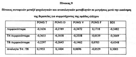 Στις συσχετίσεις (συνάφειες) μεταξύ των ψυχολογικών και ανοσολογικών μεταβλητών που υπολογίστηκαν με το συντελεστή συσχέτισης του Pearson (r), σε μετρήσεις μετά την εκπόνηση της θεραπείας για συμμετέχοντες της θεραπευτικής ομάδας παρατηρήθηκε στατιστικά σημαντική αρνητική συσχέτιση μεταξύ των μεταβλητών του POMS παράγοντα D (κατάθλιψη-μελαγχολία) και τον αριθμό των Τ4 λεμφοκυττάρων (r=-0.7344, p<0.01), (Πίνακας 8).