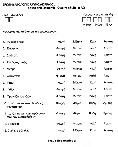 Διαδικασία: Το ερωτηματολόγιο Quality of Life in Alzheimer's Disease: Patient and Caregiver Report (QOL-AD), (Logson RG, Gibbons LE, McCurry SM., Terrill (1998), University of Washington) χορηγήθηκε στην ομάδα ελέγχου στην πόλη της Ξάνθης την Άνοιξη του 2001. Στην ομάδα των φροντιζόντων το ερωτηματολόγιο δόθηκε κατά τη διάρκεια επίσκεψής τους στη Νευρολογική Κλινική του Γενικού Περιφερειακού Νοσοκομείου "Γ. Παπανικολάου" το Φθινόπωρο του 2001. Το ερωτηματολόγιο είναι μεταφρασμένο στα ελληνικά και συνοδεύεται από σαφείς οδηγίες προς τους εξεταστές και τους συμμετέχοντες. Σύμφωνα με αυτές τις οδηγίες, ζητήθηκε από τους εξεταζόμενους να δείξουν με το δάχτυλο και να κυκλώσουν την κάθε λέξη (Φτωχή, Μέτρια, Καλή, Άριστη), όπως την είπαν. Στις περιπτώσεις που δεν έγιναν σαφείς οι οδηγίες ή υπήρχαν απορίες από τους εξεταζόμενους, επαναλαμβάνονταν οι οδηγίες χωρίς όμως να κατευθύνεται ο εξεταζόμενος προς κάποια απάντηση.