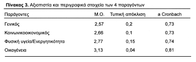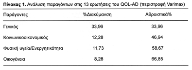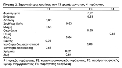 Με εφαρμογή της ανάλυσης παραγόντων πάνω στις 13 ερωτήσεις του ερωτηματολογίου Quality of Life in Alzheimer's Disease: Patient and caregiver Report, καταλήξαμε σε 4 παράγοντες, οι οποίοι μετρούν επιμέρους διαστάσεις της ποιότητας ζωής. Πρώτος παράγοντας είναι ο Γενικός παράγοντας, ο οποίος περιλαμβάνει τις ερωτήσεις που αφορούν τη διάθεση (φόρτιση 0,80), τη μνήμη (φόρτιση 0,56), ην προσωπικότητα (φόρτιση 0,76), ικανότητα διασκέδασης (φόρτιση 0,56). Ο Γενικός παράγοντας έχει δείκτη αξιοπιστίας a Cronbach=0,73. Δεύτερος παράγοντας είναι ο κοινωνικοοικονομικός παράγοντας, ο οποίος περιλαμβάνει τις ερωτήσεις που αφορούν τις συνθήκες ζωής (φόρτιση 0,63), φιλίες (φόρτιση 0,64), οικονομική κατάσταση (φόρτιση 0,82), γενικότερα για τη ζωή (φόρτιση 0,64), Ο κοινωνικοοικονομικός παράγοντας έχει δείκτη αξιοπιστίας a Cronbach=0,73. Τρίτος παράγοντας είναι ο παράγοντας φυσική υγεία/ενεργητικότητα, ο οποίος περιλαμβάνει τις ερωτήσεις φυσική υγεία (φόρτιση 0,76), ενέργεια (φόρτιση 0,83), ικανότητα για δουλειές του σπιτιού (φόρτιση 0,69). Ο παράγοντας φυσική υγεία/ενεργητικότητα έχει δείκτη αξιοπιστίας a Cronbach=0,74. Τέταρτος παράγοντας είναι ο παράγοντας οικογένεια, ο οποίος περιλαμβάνει τις ερωτήσεις οικογένεια (φόρτιση 0,89), γάμος (φόρτιση 0,88), με δείκτη αξιοπιστίας a Cronbach=0,81.