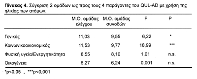 Έγινε σύγκριση των 2 ομάδων ως προς τους 4 παράγοντες του QOL-AD με χρήση της ηλικίας των ατόμων. Εφαρμόστηκε η μέθοδος ανάλυσης συνδιακύμανσης, για να εξουδετερώσουμε την επίδραση της ηλικίας. Ως προς το Γενικό παράγοντα ο μέσος όρος της ομάδας των φροντιζόντων είναι Μ.Ο.=9,55 , ενώ της ομάδας ελέγχου Μ.Ο.=11,03 , με στατιστικά σημαντική διαφορά p<0,005. Στον κοινωνικοοικονομικό παράγοντα ο μέσος όρος της ομάδας των φροντιζόντων είναι Μ.Ο.=9,77 , ενώ της ομάδας ελέγχου Μ.Ο.=11,53 , με στατιστικά σημαντική διαφορά p<0,001. Στον παράγοντα φυσική υγεία/ενεργητικότητα ο μέσος όρος της ομάδας των φροντιζόντων είναι Μ.Ο.=8,10 , στατιστικά μη σημαντική διαφορά. Στον παράγοντα οικογένεια ο μέσος όρος της ομάδας των φροντιζόντων είναι Μ.Ο.=6,24 , ενώ της ομάδας ελέγχου είναι Μ.Ο.=6,27 , στατιστικά μη σημαντική διαφορά.