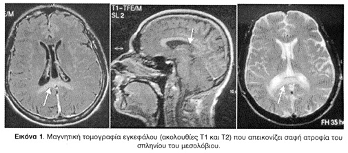 βλάβες στη λευκή ουσία του εγκεφάλου και ατροφία του μεσολοβίου, ενώ σαφώς σπανιότερα