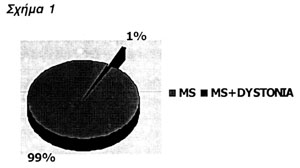 Επί τη βάσει των αποτελεσμάτων μας διαπιστώνουμε ότι σε ένα πολύ μικρό ποσοστό ασθενών που πάσχουν από πολλαπλή σκλήρυνση είναι δυνατόν να παρατηρηθούν δυστονικά φαινόμενα τα οποία εντάσσονται είτε στα πλαίσια του ημίσπασμου του προσωπικού είτε των δυστονικών θέσεων της άκρας χειρός. Το ποσοστό αυτό ανέρχεται στο 1 % (Σχήμα 1). Τα εξωπυραμιδικής φύσης δυστονικά φαινόμενα στην ΣΚΠ είναι σπάνια, αλλά όχι ανύπαρκτα, όπως προκύπτει και από τα βιβλιογραφικά στοιχεία που συγκεντρώσαμε,23-25 σύμφωνα με τα οποία τα δυστονικά φαινόμενα που κυριαρχούσαν ήταν ο σπασμός του γραφέα, ο βλεφαρόσπασμος, τμηματικές δυστονίες και το ραιβόκρανο. Παρόλα αυτά, οι μέχρι τώρα μελέτες δεν είναι αρκετές και επομένως πρέπει να πραγματοποιηθούν περισσότερες επιδημιολογικές μελέτες.