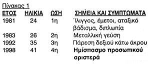 Το 1998 η ασθενής προσήλθε στην Α' Νευρολογική Κλινική παρουσιάζοντας ημίσπασμο προσωπικού αριστερά (Πίνακας 1). Από την κλινική εξέταση επιπλέον διαπιστώθηκε αύξηση του επιγονάτιου αντανακλαστικού αριστερά, δυσμετρία στις παρεγκεφαλιδικές δοκιμασίες στα άνω και κάτω άκρα κυρίως αριστερά και αταξικό βάδισμα. Σύμφωνα με την κλίμακα EDSS βαθμολογείται με 4 κατά την εισαγωγή της και σύμφωνα με την κλίμακα εκτίμησης της δυστονίας κατά Burke-Fanh-Masden (BFM) με 10.