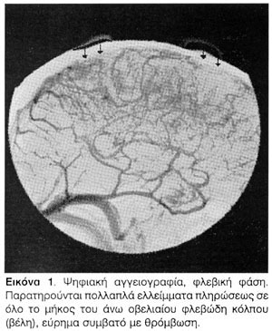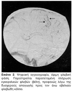 Περιγράφεται η περίπτωση ενός ασθενούς ηλικίας 29 ετών, με ελεύθερο ατομικό και κληρονομικό ιστορικό κεφαλαλγιών ή άλλου νοσήματος, ο οποίος προ εξαμήνου παρουσίασε κεφαλαλγία υποξείας έναρξης, με προοδευτική επιδείνωση, έτσι ώστε μετά δύο μήνες τα επεισόδια να έχουν συχνότητα 15-20/μήνα. Τα επεισόδια της κεφαλαλγίας είχαν ολιγόωρη διάρκεια, ινιακή εντόπιση και δεν συνοδευόταν από φωτοφοβία, ηχοφοβία, ναυτία ή έμετο. Οι κρίσεις δεν ξυπνούσαν τον ασθενή και ενίοτε επιδεινώνονταν με την επίκυψη. Δύο περίπου εβδομάδες προ της εισαγωγής του, ο ασθενής παρουσίασε ήπιο θάμβος όρασης, το οποίο προοδευτικά επιδεινωνόταν και για αυτό το λόγο επισκέφθηκε οφθαλμίατρο, ο οποίος διαπίστωσε έκπτωση της οπτικής οξύτητας και οίδημα οπτικών θηλών αμφοτερόπλευρα, παρέπεμψε δε τον ασθενή στην κλινική μας. Στην εισαγωγή ο ασθενής βρισκόταν σε καλή γενική κατάσταση, η δε αντικειμενική νευρολογική του εξέταση ήταν χωρίς παθολογικά ευρήματα πλην αμφοτερόπλευρου οιδήματος οπτικών θηλών. Ο ασθενής υποβλήθηκε σε μαγνητική τομογραφία εγκεφάλου, η οποία ανέδειξε 2-3 μικροεστιακές αλλοιώσεις στη λευκή ουσία, χωρίς χαρακτηριστικά απομυελινωτικού τύπου βλαβών, σε μαγνητική τομογραφία ΑΜΣΣ, που ήταν φυσιολογική και σε οσφυονωτιαία παρακέντηση, στην οποία καταγράφηκε σημαντική αύξηση της πίεσης διάνοιξης του ΕΝΥ (>45 cm στήλης H2O). Λόγω της αυξημένης ενδοκράνιας πίεσης, ακολούθησε ψηφιακή ενδαρτηριακή αγγειογραφία όπου παρατηρήθηκε λίαν καθυστερημένη και βραδεία αποχέτευση του φλεβικού δικτύου προς τον άνω οβελιαίο κόλπο, ο οποίος παρουσίαζε πολλαπλά ελλείμματα πληρώσεως σε όλο το μήκος του. Συνυπήρχε παρατεταμένη πλήρωση των εγκεφαλικών φλεβών προφανώς λόγω της δυσχερούς απαγωγής προς τον στενωμένο οβελιαίο κόλπο (Εικόνες 1 και 2). Τα ευρήματα ήταν συμβατά με θρόμβωση του άνω οβελιαίου κόλπου με μερική επανασηραγγοποίηση. Η διερεύνηση στράφηκε στην αναζήτηση των αιτίων της θρόμβωσης αυτής. Στον εργαστηριακό έλεγχο οι τιμές αιματοκρίτη, λευκών αιμοσφαιρίων, και αιμοπεταλίων ήταν διαρκώς αυξημένες (αιματοκρίτης 49-50%, λευκά αιμοσφαίρια 10-16 Κ/uL, αιμοπετάλια 400-500 K/uL). Τα ευρήματα από το περιφερικό αίμα αλλά και την εξέταση του μυελού και την οστεομυελική βιοψία που ακολούθησαν ήταν ενδεικτικά μυελοϋπερπλαστικού συνδρόμου με ήπια στοιχεία ίνωσης. Ο ασθενής παραπέμφθηκε σε ειδικό κέντρο για περαιτέρω αντιμετώπιση.