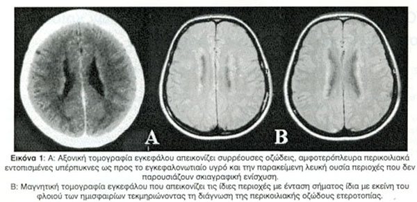 Η όψιμη εμφάνιση επιληπτικών κρίσεων οδήγησε ως ήταν λογικό στον άμεσο απεικονιστικό έλεγχο προκειμένου να αποκλειστούν τα διάφορα πιθανά αίτια συμπτωματικής επιληψίας (π.χ. χωροκατακτητικές βλάβες). Σε πρώτο στάδιο έγινε αξονική τομογραφία η οποία ανέδειξε παθολογικά ευρήματα περικοιλιακής αμφοτερόπλευρης εντόπισης, μην επιτρέποντας όμως το διαχωρισμό μεταξύ ετεροτοπίας φλοιού και οζώδους σκλήρυνσης9. Αν και η ηλικία έναρξης της νόσου, η κλινική εικόνα και η κανονική νοητική ανάπτυξη της ασθενούς, τα φυσιολογικά ευρήματα από τον οφθαλμολογικό και δερματολογικό έλεγχο καθώς και η απουσία ενδο-κρανιακών αποτιτανώσεων απομάκρυναν το ενδεχόμενο της οζώδους σκλήρυνσης αποφασίστηκε να γίνει ακολούθως μαγνητική τομογραφία εγκεφάλου. Αυτή αποσαφήνισε οριστικά τη φύση των βλαβών και ουσιαστικά έθεσε τη διάγνωση της περικοιλιακής οζώδους ετεροτοπίας.