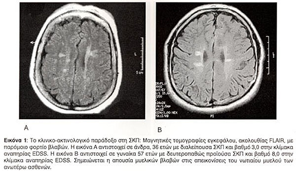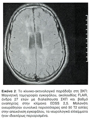 Η συσχέτιση του βαθμού αναπηρίας, όπως αυτός προσδιορίζεται από την κλίμακα EDSS, με τη βαρύτητα των βλαβών στη συμβατική μαγνητική τομογραφία έχει βρεθεί να είναι χαμηλή27,28, έως οριακή29. Η περιγραφείσα δυσαρμονία μεταξύ του φορτίου των βλαβών στη συμβατική μαγνητική τομογραφία και της κλινικής εικόνας αποτελούν την πρώτη όψη του "κλινικο-ακτινολογικού παραδόξου" της ΣΚΠ (Εικόνα 1, Εικόνα 2). Η δεύτερη όψη του παραδόξου, όπως έχει ήδη περιγραφεί, αφορά στους ασθενείς που εμφανίζουν βλάβες σε οξεία φάση στη μαγνητική τομογραφία χωρίς συνοδό κλινική έξαρση της νόσου. Η τρίτη όψη αφορά στους ασθενείς με πρωτοπαθώς προϊούσα ΣΚΠ. Στις περιπτώσεις αυτές η ανεύρεση ολιγάριθμων βλαβών στη μαγνητική τομογραφία, παρά τη μεγάλη κλινική αναπηρία, αποτελεί συνήθως τον κανόνα (Εικόνα 3).