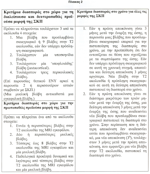 Τα νέα διαγνωστικά κριτήρια (κριτήρια McDonald) της ΣΚΠ που θεσπίστηκαν το 20011, συμπεριέλαβαν απεικονιστικά κριτήρια από προηγούμενες μελέτες για την επιβεβαίωση της διασποράς της νόσου στο χώρο και το χρόνο2,11 (Πίνακας 2). Κάνουν χρήση αποκλειστικά και μόνο των ακολουθιών Τ2 και Τ1 με σκιαγραφικό. Η αυστηρότητα των κριτηρίων ως προς την πιστοποίηση της διασποράς στο χώρο οφείλεται στην προσπάθεια αύξησης της ειδικότητας, ενδεχομένως εις βάρος της ευαισθησίας.