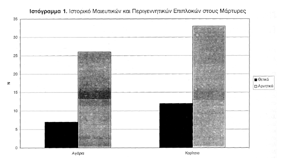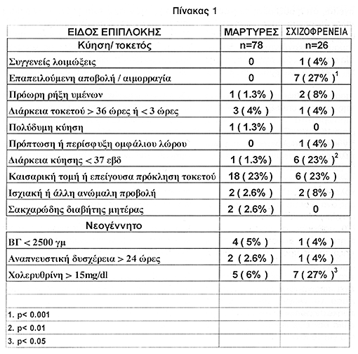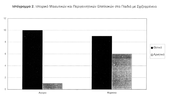 Σε 19 από τους 26 ψυχιατρικούς ασθενείς υπήρχε τουλάχιστον μια μαιευτική ή περιγεννητική επιπλοκή (73%). Σε 19 από τους 78 μάρτυρες υπήρχε τουλάχιστον μια μαιευτική ή περιγεννητική επιπλοκή (24%). Η συχνότητα επιπλοκών στο ιστορικό ασθενών με σχιζοφρένεια ήταν αυξημένη σε σχέση με τους μάρτυρες (p<0.001). Στους ψυχιατρικούς ασθενείς, θετικό ιστορικό είχαν 10 από τα 11 αγόρια και 9 από τα 15 κορίτσια. Στους μάρτυρες, θετικό ιστορικό είχαν 7 από τα 33 αγόρια και 12 από τα 45 κορίτσια (ιστογράμματα 1 και 2). Η σχετική πιθανότητα (odds ratio) βεβαρημένου ιστορικού σε αγόρια με σχιζοφρένεια ήταν 37.32 και σε κορίτσια 3.32 (95% όρια αξιοπιστίας, αντίστοιχα για τα αγόρια 4.01-170.37 και τα κορίτσια 0.36-15.27).