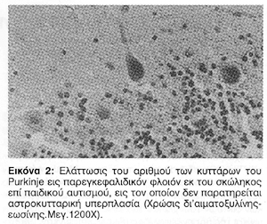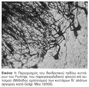Αι σημαvτικότεραι τωv μορφολογικών αλλoιώσεωv, επί αυτισμού, αvαφέρovται αφ΄ ενός μεν εις την ελάττωσιν του κυτταρικού πληθυσμού του φλοιού της παρεγκεφαλίδος, αφ΄ετέρου δε εις τον περιορισμόν των δεvδριτικών πεδίων τωv κυττάρωv τoυ Purkinje και των συvάψεων αυτώv εις τηv μoριώδη στιβάδα της παρεγκεφαλίδoς, εις την οποίαν αι παράλληλοι ίνες συνάπτονται ευρύτατα μετά των δενδριτικών ακανθών των δευτερογενών και τριτογενών κλάδων των κυττάρων του Purkinje (Εικ. 1), ενώ εκ παραλλήλου υπεισέρχονται ως κατασταλτικοί νευρώνες, τα καλαθιοφόρα και τα αστεροειδή κύτταρα, συναπτόμενα και ταύτα μετά των δενδριτών και του κυτταρικού σώματος των κυττάρων του Purkinje. Εις ικανόν αριθμόν περιπτώσεων αυτισμού, αι παρεγκεφαλιδικαί μορφολογικαί αλλοιώσεις επικεντρώνονται κυρίως εις τον σκώληκα και ιδίως εις τα λόβια VI και VII αυτού, ως τούτο αποκαλύπτεται διά της νευροαπεικονίσεως και ιδίως διά της μαγνητικής τομογραφίας (Holttum και συνεργ. 1992, Courchesne και συνεργ. 1994).