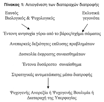 Oι ψυχολογικοί παράγοντες σχετίζονται με προηγούμενες εμπειρίες ζωής, σχέση του ατόμου με το φαγητό, αντιλήψεις του ατόμου για τον εαυτό του και το ιδεώδες σώμα καθώς και με παράγοντες προσωπικότητας. Πιο συγκεκριμένα, το άτομο όταν έρχεται αντιμέτωπο με κάποια αρνητικά γεγονότα ζωής (εκλυτικά αίτια), επειδή α) έχει δυσλειτουργικές αντιλήψεις για τον εαυτό του, β) διαθέτει ανεπαρκείς δεξιότητες επίλυσης προβλημάτων, γ) έχει δυσκολία στην έκφραση συναισθημάτων και δ) διαθέτει συγκεκριμένες αντιλήψεις και γνωσιακά σχήματα σε σχέση με το βάρος και το σχήμα του σώματος, καθώς και την τροφή, του δημιουργείται έντονα δυσφορικό συναίσθημα το οποίο προσπαθεί μέσω της διατροφής να αντιμετωπίσει (Χαρίλα, 2004). Έτσι, οδηγείται σε κάποια διατροφική διαταραχή (Πίν. 1).