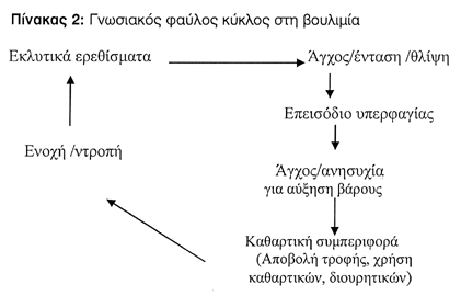 Η παθολογική διατροφική συμπεριφορά της υπερφαγίας, γίνεται μέσον αντιμετώπισης δυσάρεστων καταστάσεων, αφού φαίνεται να μειώνει ο άγχος (Katzman, 1989). Ταυτόχρονα όμως το άτομο έχει δυσλειτουργικές αντιλήψεις για το βάρος και το σχήμα του σώματός του, που το οδηγούν σε υπερβολική ανησυχία και άγχος σχετικά με την αύξηση του βάρους. Έτσι, προβαίνει σε καθαρτικές συμπεριφορές οι οποίες βραχυπρόθεσμα ανακουφίζουν το άγχος του σχετικά με την επικείμενη αύξηση του βάρους, μακροπρόθεσμα όμως του δημιουργούν ενοχή και ντροπή γύρω από την καθαρτική συμπεριφορά. Τα συναισθήματα αυτά γίνονται εκλυτικά ερεθίσματα, οπότε δημιουργείται φαύλος κύκλος ο οποίος διατηρεί το άτομο στην βουλιμία (Πίν. 2).