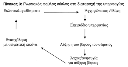 Ο γνωσιακός μηχανισμός στην διαταραχή της υπερφαγίας, όπου απουσιάζουν οι καθαρτικές συμπεριφορές, είναι παρόμοιος (Πίν. 3). Ωστόσο, εδώ το άτομο οδηγείται σε αύξηση του βάρους η οποία του δημιουργεί δυσάρεστα συναισθήματα και ασχολείται με την σωματική του εικόνα. Παράλληλα, τα δυσάρεστα αυτά συναισθήματα γίνονται εκλυτικά ερεθίσματα. Ο παραπάνω γνωσιακός φαύλος κύκλος διατηρεί το άτομο στην διαταραχή της υπερφαγίας.