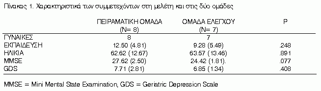 Οι συμμετέχοντες στην έρευνα ήταν επισκέπτες των κέντρων ημέρας της Ελληνικής Εταιρείας Νόσου Alzheimer και Συγγενών Διαταραχών, από την ευρύτερη περιοχή της Θεσσαλονίκης. Το σχέδιο έρευνας, περιλάμβανε μια πειραματική ομάδα ασθενών με ΗΝΔ, καθώς και μια αντίστοιχη ομάδα ελέγχου. Για τη διάγνωση της ΗΝΔ τηρήθηκαν τα κριτήρια των Petersen et al. (2001). Η πειραματική ομάδα αποτελούνταν από 8 γυναίκες, μέσης ηλικίας 62.62 (12.67) ετών, με μέση εκπαίδευση 12.50 (4.81) έτη, με μέσο όρο MMSE 27.62 (ΤΑ=2.50), BDI 20.71 (10.99), BAI 20.42 (16.88), και GDS 7.71 (2.81). Η αντίστοιχη ομάδα ελέγχου περιελάμβανε 7 γυναίκες, μέσης ηλικίας 63.57 (13.46) ετών, με μέση εκπαίδευση 9.28 (5.49) έτη, με μέσο όρο MMSE 24.42 (1.81), και GDS 6.85 (1.34). Σύμφωνα με τη δοκιμασία t-test (Πίνακας 1), τόσο η πειραματική όσο και η ομάδα ελέγχου ήταν εξισωμένες ως προς τα έτη εκπαίδευσης (p=0.248), την ηλικία (p=0.891), την επίδοση στη δοκιμασία MMSE (p=0.077), και την κατάθλιψη (GDS p=0.408). Επίσης, υπήρχε εξίσωση μεταξύ των ομάδων και ως προς τις νοητικές ικανότητες που εξετάσθηκαν για τις ανάγκες της μελέτης, σύμφωνα με τη μη παραμετρική δοκιμασία Mann-Whitney, και οι οποίες παρουσιάζονται στον Πίνακα 2.