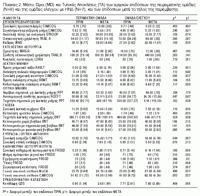 Κατά το τέλος της παρέμβασης όμως, καταγράφηκαν σημαντικές διαφορές μεταξύ των ομάδων, καθώς επήλθε βελτίωση σε νοητικές ικανότητες της πειραματικής ομάδας. Οι ικανότητες που βελτιώθηκαν αφορούσαν την οπτική και λεκτική μνήμη, τις ικανότητες προσοχής, τη γλώσσα, καθώς και την ψυχοκινητική ταχύτητα. Ως άμεσο αποτέλεσμα της βελτίωσης των συγκεκριμένων ικανοτήτων, υπήρξε η βελτίωση της συνολικής νοητικής επίδοσης. Η βελτίωση των ικανοτήτων που προαναφέρθηκαν, είναι οι ικανότητες οι οποίες καλλιεργήθηκαν κατά τη διάρκεια του προγράμματος. Μάλιστα η βελτίωση στην λεκτική μνήμη, είναι μια ικανότητα η οποία αναφέρεται και σε άλλες μελέτες να βελτιώνεται με προγράμματα που έχουν να κάνουν με τεχνικές διαχείρισης του άγχους80,81. Τέλος η πειραματική ομάδα βελτιώθηκε σε σχέση με την ομάδα ελέγχου στην κατάθλιψη, αλλά και στην καθημερινή της λειτουργικότητα, στους τομείς του ύπνου και της συγκινησιακής κατάστασης, καθώς και στην ικανότητα συγκέντρωσης και στη συνολικότερη καθημερινή λειτουργικότητα. Αντίστοιχα η ομάδα ελέγχου δε βελτιώθηκε σε σχέση με την πειραματική ομάδα σε καμία ικανότητα.