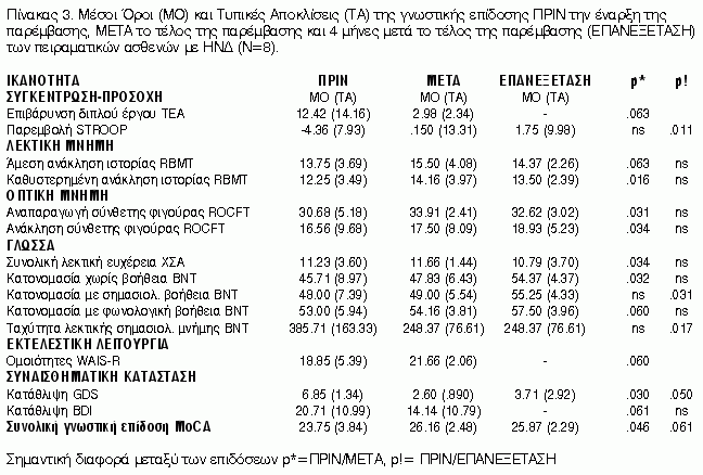 Όσον αφορά την 3η εκτίμηση που πραγματοποιήθηκε 4 μήνες μετά το τέλος της παρέμβασης, διαπιστώθηκαν στατιστικά σημαντικές διαφορές, σε σχέση με την 1η εκτίμηση, στο ποσοστό παρεμβολής της τάσης για ανάγνωση STROOP (p=0.011), την άμεση ανάκληση λέξεων RAVLT (p=0.013), τη λεκτική σημασιολογική μνήμη χωρίς βοήθεια BNT (p=0.016), τη λεκτική σημασιολογική μνήμη με σημασιολογική βοήθεια BNT (p=0.031), και την ταχύτητα λεκτικής σημασιολογικής μνήμης BNT (p=0.017). Επίσης, παρουσιάστηκε τάση διαφοράς μεταξύ των επιδόσεων στη συνολική γνωστική επίδοση MοCA (p=0.061) και στο επίπεδο της κατάθλιψης GDS (p=0.050).