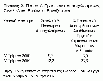 Στοιχεία της Ελληνικής Στατιστικής Αρχής (ΕΛ.ΣΤΑΤ., πρώην Ελληνική Στατιστική Υπηρεσία) γιά το τέταρτο τρίμηνο των δύο τελευταίων ετών συμφωνούν. Όπως καταδεικνύει ο επόμενος πίνακας, το συνολικό ποσοστό των προσωρινά απασχολούμενων υπερδιπλασιάστηκε το 2009 σε σύγκριση με το 2008. Στην πιό ευάλωτη κατηγορία γιά ανεργία και κοινωνικό αποκλεισμό, αυτή που αποτελείται από τους ανειδίκευτους εργάτες, τους χειρώνακτες και τους μικροεπαγγελματίες, παρατηρείται μία αύξηση κατά 10 ποσοστιαίες μονάδες περίπου γιά το ίδιο χρονικό διάστημα.