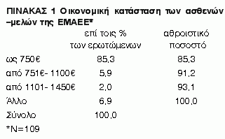 Το δείγμα απετέλεσε 109 άτομα ηλικίας 20 έως 60 ετών (μέση ηλικία 36, τ.α.=9 έτη), που έχουν ολοκληρώσει 18μηνο το πρόγραμμα ψυχοκοινωνικής αποκατάστασης. Η πλειονότητα τους δείγματος (70%) είναι άνδρες και το 30% γυναίκες ενώ τα δύο φύλα δεν διαφέρουν ως προς την μέση ηλικία. Τα δύο φύλα δεν διαφέρουν επίσης ως προς την οικονομική κατάσταση των ιδίων αλλά και της οικογένειας τους. Όπως φαίνεται στον Πίνακα 1 (από κοινού για άνδρες και γυναίκες) το εισόδημα των ασθενών στην συντριπτική τους πλειονότητα είναι έως 750€ (85%).