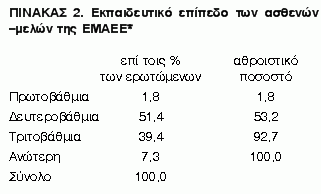 Σχετικά με το εκπαιδευτικό επίπεδο το 62,4% των ασθενών έχει ολοκληρώσει τις σπουδές του. Οι γυναίκες ασθενείς ολοκληρώνουν τις σπουδές τους σε μεγαλύτερο ποσοστό από ότι οι άνδρες (85 έναντι 53%, p<0.001) ενώ το εκπαιδευτικό επίπεδο δεν διέφερε ανάμεσα στα δύο φύλα.