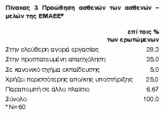 Συμπεράσματα: Τα αποτελέσματα υποδεικνύουν ότι παρόλο που αρκετοί ασθενείς έχουν αξιολογηθεί από τους θεραπευτές ότι μπορούν να εργαστούν στην ελεύθερη αγορά εργασίας, υπάρχει ένας εξίσου σημαντικά μεγάλος αριθμός ψυχικά ασθενών που αδυνατεί να εργαστεί. Καθώς ο αριθμός των ασθενών που απευθύνονται σε μονάδες ψυχοκοινωνικής και επαγγελματικής αποκατάστασης αυξάνει συνεχώς, αυξάνονται και οι ανάγκες για την προώθηση και την ένταξη στην κοινότητα. Επομένως, είναι σημαντικό να αναζητηθούν λύσεις στον τομέα της Κοινωνικής Οικονομίας μέσω της ανάπτυξης αυτοδιαχειριζόμενων δομές εργασιακής ένταξης των ψυχικά ασθενών, όπως Κοινωνικές Επιχειρήσεις και Κοινωνικοί Συνεταιρισμοί Περιορισμένης Ευθύνης. Εγκέφαλος 2010, 47(4):199-206.