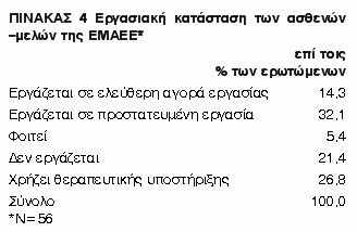 Η διερεύνηση της εργασιακής ένταξης των ασθενών με σχιζοφρένεια που έχουν ολοκληρώσει το πρόγραμμα ψυχοκοινωνικής αποκατάστασης αποτελεί μία από τις σημαντικούς παραμέτρους στην αξιολόγηση των ψυχωσικών ασθενών. Στην παρούσα εργασία παρουσιάζονται ενδεικτικά κάποια αποτελέσματα σχετικά με κοινωνικοοικονομικά και κλινικά χαρακτηριστικά καθώς και αποτελέσματα που σχετίζονται με ζητήματα εργασιακής προσαρμογής και ένταξης μικρού δείγματος από τον συνολικό πληθυσμό της ΕΜΑΕΕ