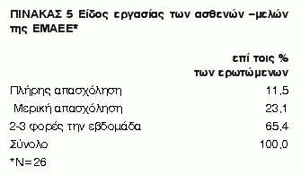 Το 65% των ατόμων δεν εργαζόταν πριν την νόσο, ενώ για τα υπόλοιπα άτομα το75% εργαζόταν έως 4 έτη. Μετά την εκδήλωση της νόσου δεν εργαζόταν το 86% των ατόμων, ενώ για τα υπόλοιπα άτομα το 75% επίσης εργαζόταν έως 4 έτη.